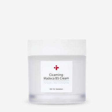 Cuskin Dr.Solution Cicaming B5 Madeca Cream – lengvas raminamasis kremas su pantenoliu, alantoinu, Azijinės centelės ingredientų kompleksu, 10 rūšių hialurono rūgšties prižiūri jautrią ir probleminę odą, minkština, drėkina, mažina uždegimą.